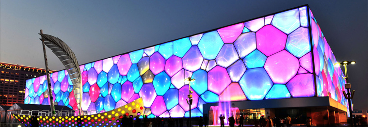 由ETFE(乙烯-四氟乙烯共聚物)生料直接制成。ETFE不仅具有优良的抗冲击性能、电性能、热稳定性和耐化学腐蚀性,而且机械强度高,加工性能好。近年来,ETFE膜材的应用在很多方面可以取代其他产品而表现出强大的优势和市场前景。这种膜材透光性特别好,号称“软玻璃”,质量轻,只有同等大小玻璃的1%;韧性好、抗拉强度高、不易被撕裂,延展性大于400%;耐候性和耐化学腐蚀性强,熔融温度高达200℃;具有良好的声学性能。自清洁功能使表面不易沾污,且雨水冲刷即可带走沾污的少量污物,清洁周期大约为5年。另外,ETFE膜可在现成预制成薄膜气泡,方便施工和维修。ETFE也有不足,如外界环境容易损坏材料而造成漏气,维护费用高等,但是随着大型体育馆、游客场所、候机大厅等的建设,ETFE更突显自己的优势。目前生产这种膜材的公司很少,这种膜材的研发和应用在国外发达国家也不过十几年的历史。北京奥运会场馆“鸟巢”和“水立方”膜结构采用ETFE膜材,是目前国内最大的ETFE膜材结构建筑,膜材采用进口产品。“鸟巢”采用双层膜结构,外层用ETFE防雨雪防紫外线,内层用PTFE达到保温、防结露、隔音和光效的目的
