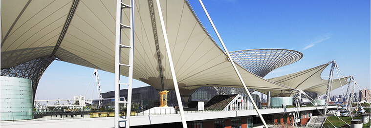 PTFE膜材是在超细玻璃纤维织物上涂以聚四氟乙烯树脂而成的材料。 PTFE膜材料的特点: (1)PTFE膜材的特点是强度高,中等强度的PTFE 膜厚度仅0.8mm,但它的拉伸强度已达到钢材的水平;而且弹性模量较低,有利于膜材形成复杂的曲面造型; (2)使用温度范围广,能够在-70℃~230℃的温度范围内使用; (3)具有独特的光学性能,白天入射光线成为自然温射光,防止眩目,无阴影,光线均匀分布;几乎没有紫外线透过,防止了内部装饰材料和设备的褪色;夜间高反射性能使得房间具有照明效果,减少电能消耗,而且可衬托出夜 空中建筑物的辉煌; (4)自洁性好,雨水可冲刷掉表面的附着物; (5)具有高透光率,透光率为13%,对热能反射率73%,热吸收量很少; (6)使用寿命在25年以上。